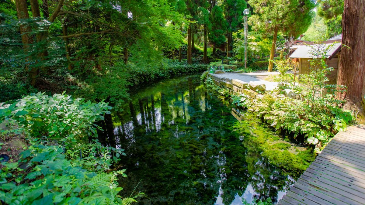 熊本県を代表する水源池のひとつでは、年間を通じて水温14度、毎分60トンもの湧水があり、熊本市の白川の源流となっています。湧き水は自由に飲めて、持ち帰りもOK。加熱処理済みの水や空ボトルも販売されており、手軽に“名水の一杯”を楽しめます。
