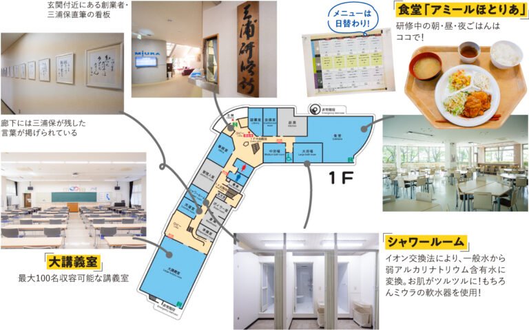 1階フロアには、三浦リラトレセンターのスタッフが仕事をしている事務所と、最大100名収容可能な大講義室、研修受講社員が食事をする食堂「アミールほとりあ」(※)、シャワールーム(男女別)などがあります。