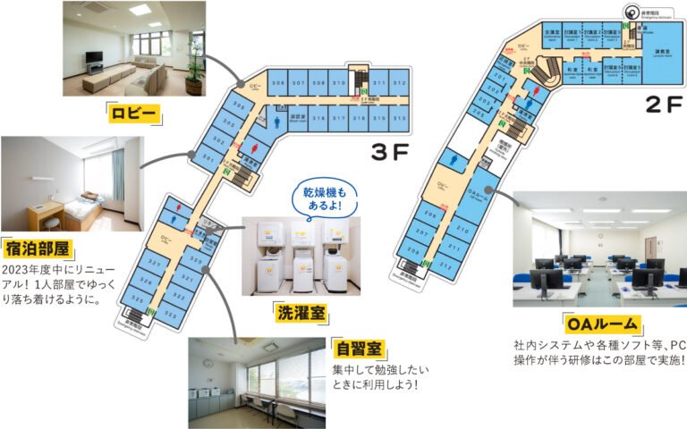 2階フロアは、講義室と、パソコンを使った講義を行うOAルーム。宿泊部屋も数室あります。