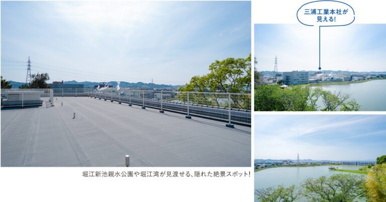 三浦工業の本社ビルと工場が見えるだけではなく、天気が良い日には遠くの堀江湾も一望できます。