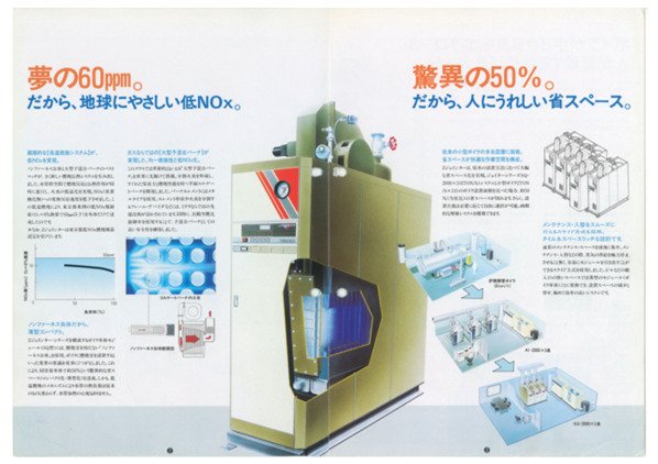 同時期、保さんはアメリカに行く機会があり、その宿泊先のホテルでクレイトンボイラの多缶設置を見たとおっしゃっていた。当時ミウラは1トン/h以下の蒸気ボイラしか製造できなかったのだが、この多缶設置方式は蒸気消費量の多い産業分野へ進出できるキー技術になると確信したようだ。そしてその時保さんはセラミックファイバー燃焼のボイラも見ていたと思われる。