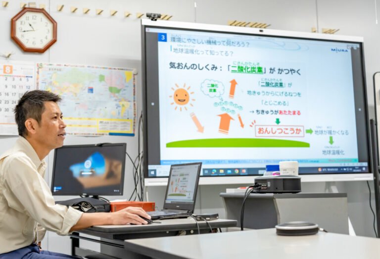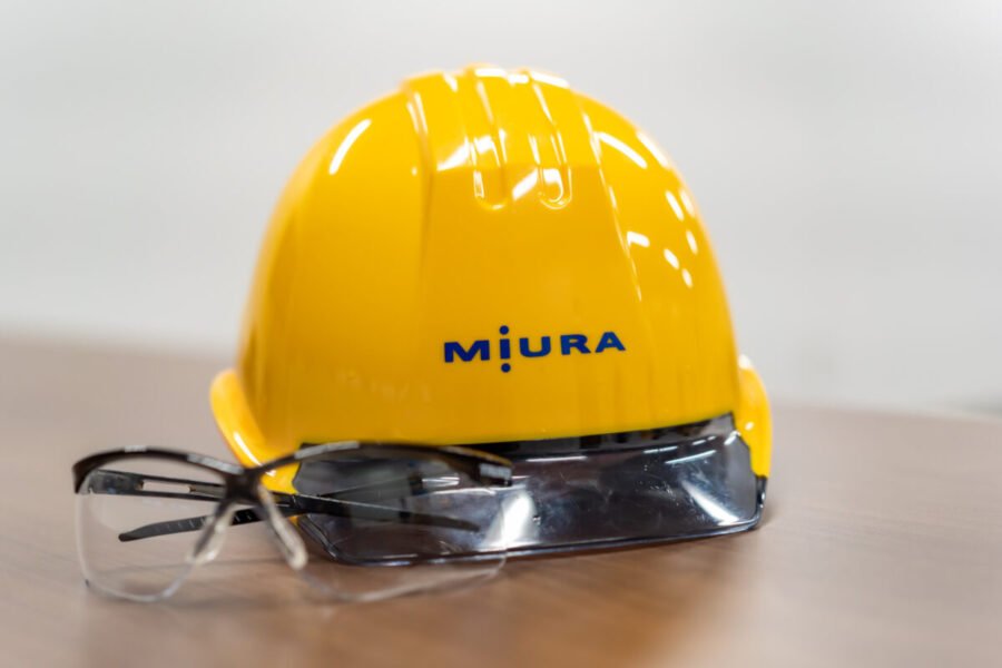 次に、技術のお仕事を教えてもらいに大谷さんがいる事務所を訪問しました。普段、この技術開発センター(大谷さんの所属部署がある建物)に一般の方は立ち入りできませんが、この日は特別です!会議室では「おんしつこうか」や「ちきゅうおんだんか」について、どのような現象かを説明いただき、これに対してミウラの技術が何に貢献しているのか、またそのための大谷さんの部署の役割は何なのか、実際に開発した製品の特長などをお話しいただいたあと、実機を動かして見せてもらいました。