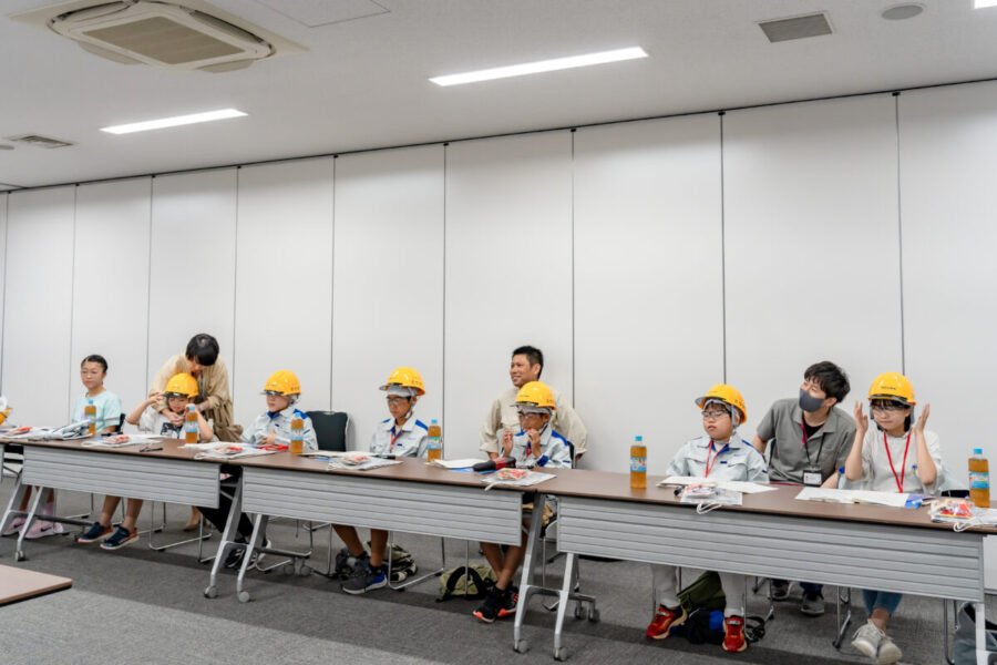 お父さんお母さんと一緒に会社に出社してきた4組の家族。「おはようございます!」と緊張した面持ちで7人の子どもたちが集合しました。机の上には、本日の進行表や会社案内、ヘルメットやセーフティーグラスが並んでいます。言葉数少なく静かに過ごしていましたが、作業着やヘルメットを試着したり、机の上に並べられた資料を読んだりしながらみんなが揃うまでの時間を過ごしていました。全員集合したら、まずは主催者の挨拶。そしてお互いの自己紹介、本日のスケジュールを確認し、「子ども参観日」がスタートしました!