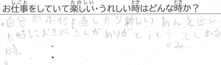 Q. 仕事をしていて楽しい・うれしい時はどんな時か?A. 自分がボイラを直したり新しい案を出したときにお客さんが「ありがとう」と言ってくれる時。