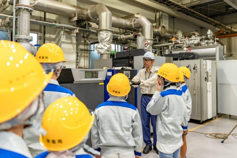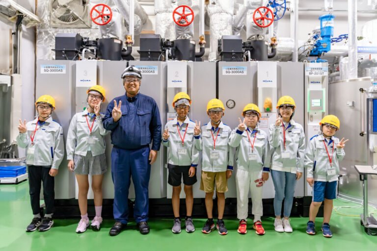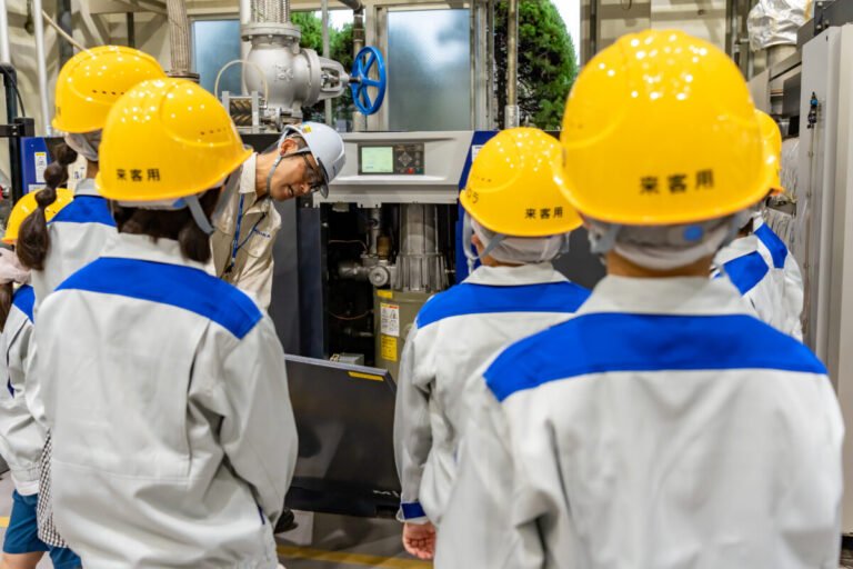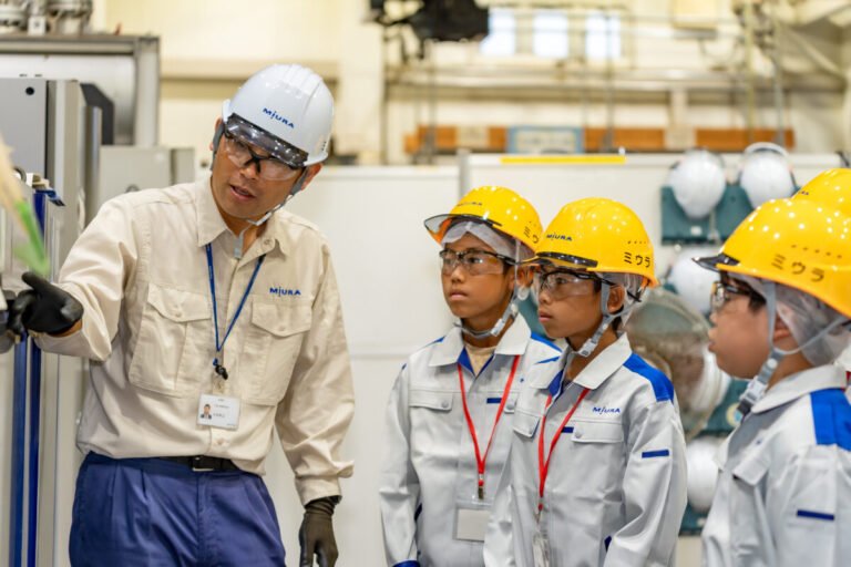 車で15分ほど離れた工場(北条工場エリア)を見学するため、子どもたちはタクシーで移動します。ミウラの主力製品である小型ボイラの組み立てラインを見学します。