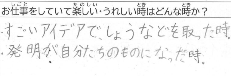 Q. お仕事をしていて楽しい・うれしい時はどんな時か?A. すごいアイデアで賞などを取った時。 発明が自分たちのものになった時。(=特許の取得)