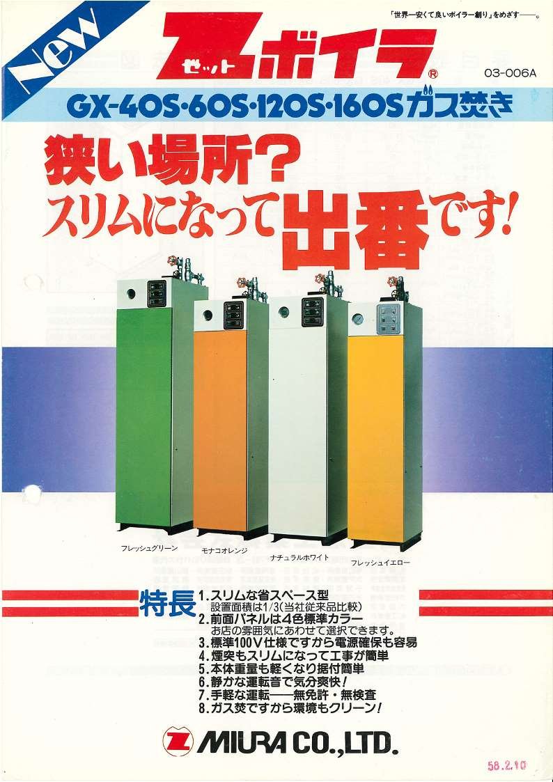1981年のガス焚き簡易ボイラGX型の話を一つ。当時はボイラの配管類は露出しているのが一般的でしたが、配管類をケーシングに収めたデザインをされ、さらに前面のケーシングを4色から自由に選べるカラーバリエーションにしたのです。ボイラでは、初めての試みだったのではないでしょうか。