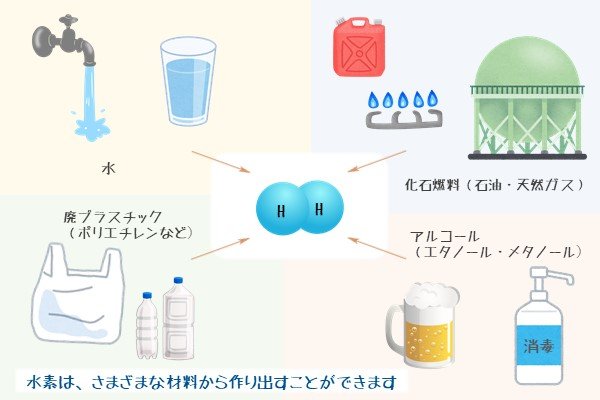 それ以外にも、化石燃料(石油・天然ガスなど)、アルコール(メタノール・エタノールなど)のほか、廃プラスチックや下水汚泥のように、捨てられていく資源など、さまざまなものを材料としてつくりだすこともできます。そのため、「限りない資源」に近いと言われています。