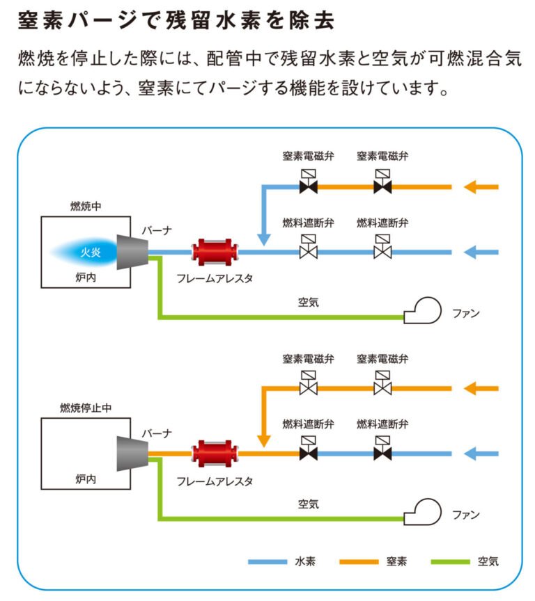でもミウラの水素ボイラなら大丈夫。運転停止時に燃料配管に窒素を流し、残った水素をきちんと除去する仕組みを取り入れています。