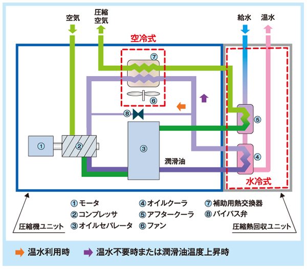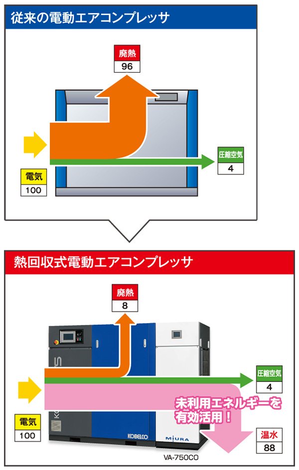 そこで活躍するのが、熱を集めて高温水として再利用することができる「熱回収式電動エアコンプレッサ VA」です。