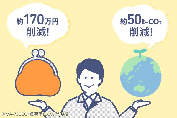 またVA-750CO型の場合は、負荷をかけるのに必要な分だけの電力でモータの回転を制御する「インバータ制御」によって、さらなる省エネも実現しています。そして熱回収により、ガスなどの燃料を使ってお湯を沸かす量を減らせるわけですから、とことん省エネ。