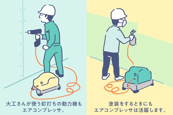 圧縮した空気が勢いよく噴き出す力を利用して、ものを飛ばしたり(エアブロー)、動かしたり(エアドリル、エア駆動バルブ)、さらに塗料と混ぜることで塗装することもできます。