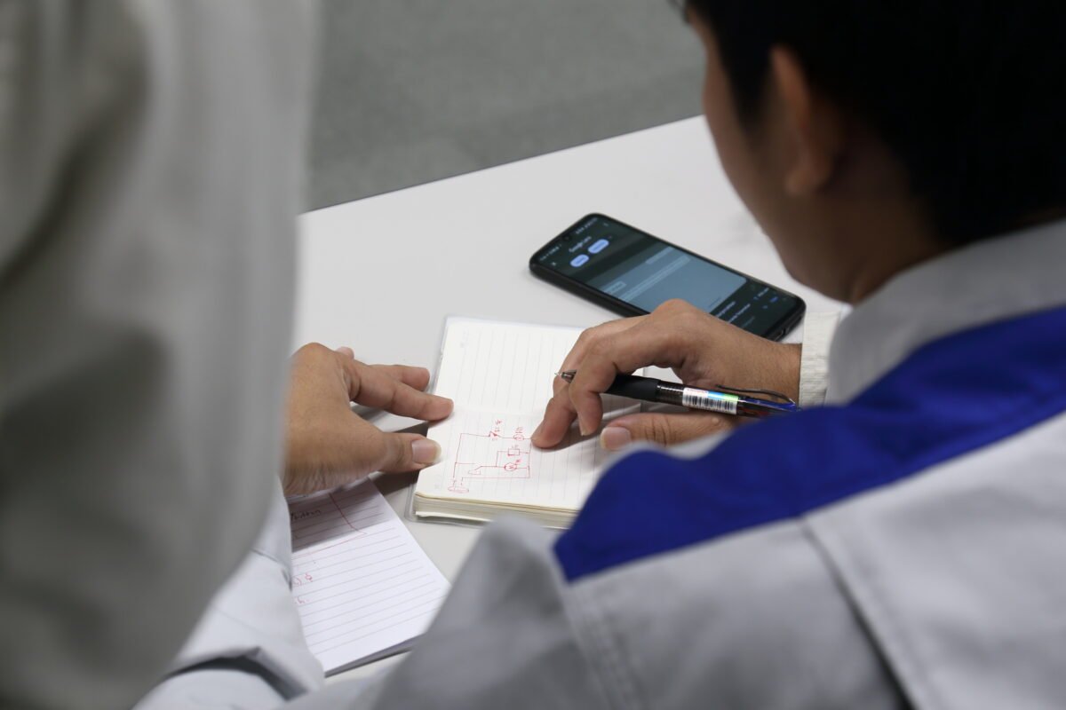 実際お客様のところで作業することになると、今この機械の操作方法を間違えて止めてしまったら、お客様や工場の工程にどれだけ迷惑がかかるかと考えてすごく緊張してしまいますが、ここでしっかり勉強して自信をつけて臨めば冷静に考えて判断することができる!