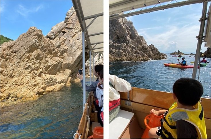 (上:だいせんホワイトリゾートにて、下:浦富海岸島めぐり小型船「うらどめ号」より)