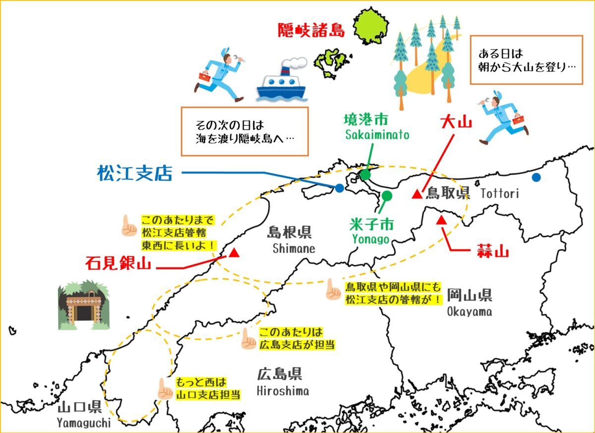 松江支店の担当地域は、島根県東部と鳥取県米子市、境港市、さらに岡山県蒜山地方――と3県をまたいでいます。