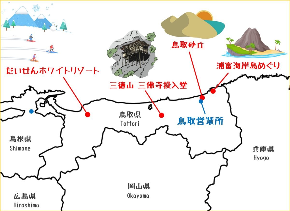 鳥取営業所も、鳥取県に加え、兵庫県・岡山県の一部が管轄で、3県をまたいでいます。