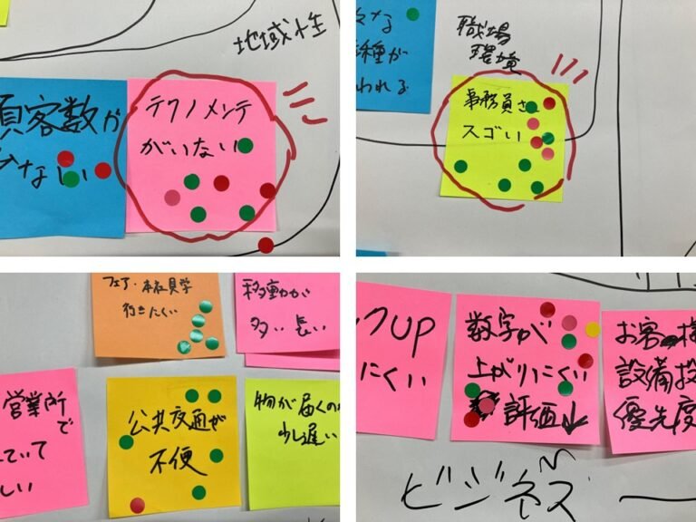 松江支店と鳥取営業所から参加してくださった10人に、中四国・九州統括部長の松田さんを加えた計11人を3つにグループ分けし、松山本社編集部の7人も、オブザーバー的に加わりました。グループ内でそれぞれの思いをふせんに書き出し、模造紙に貼りながら、日頃の思いを吐露してもらいました。
