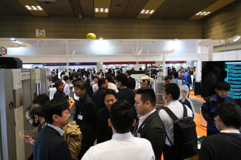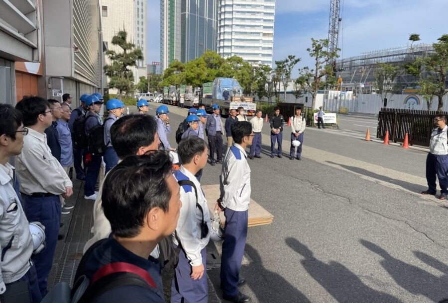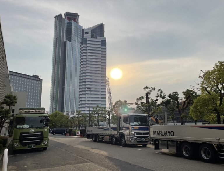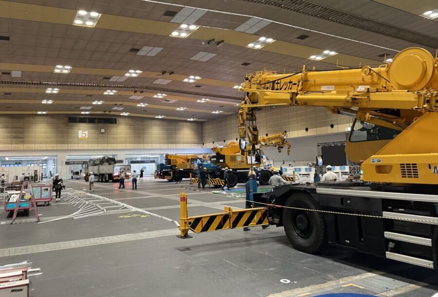 開催前日の早朝、各部署の設営担当者がぞくぞくと準備万端でインテックス大阪5号館裏に集合!展示製品を積んだトラック、搬入用のクレーン車も会場周囲で今か今かと待っています。