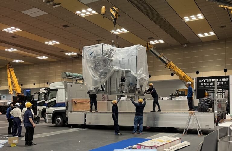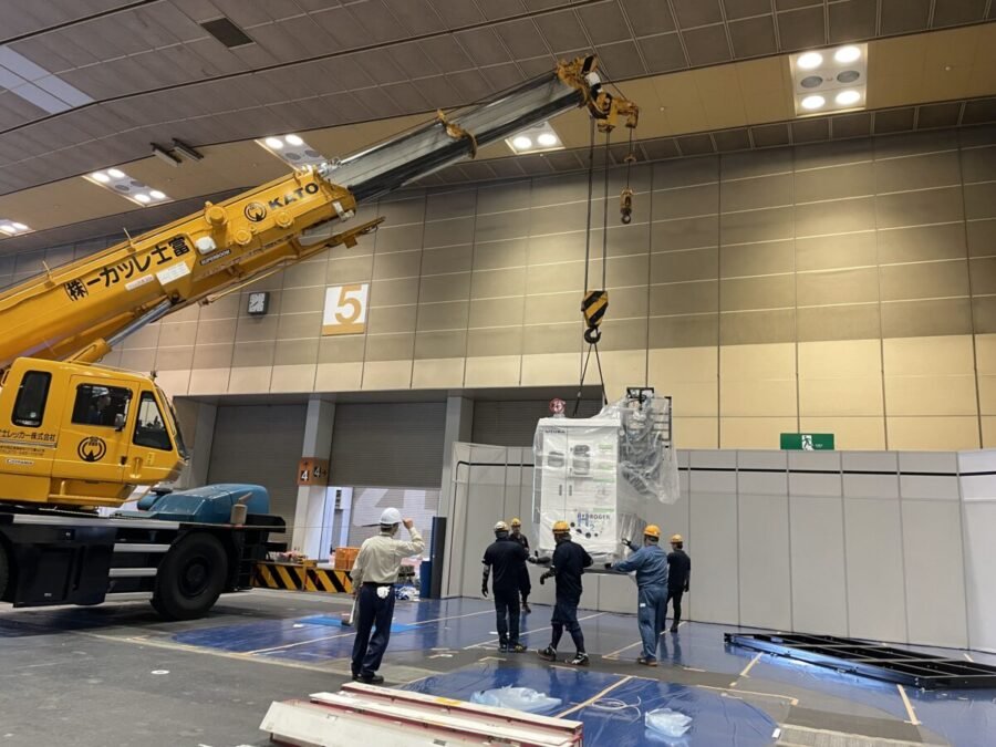装飾業者さんが前日にカーペットを施工しており、搬入の下準備はできています。トラックからの荷下ろしは、工事業者さんとミウラのフィールドエンジニアのメンバーでスムーズに進行していきます。日ごろからの現場作業で手慣れたものです。