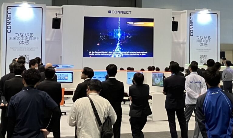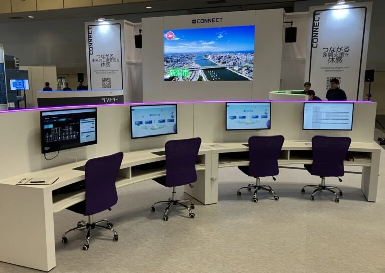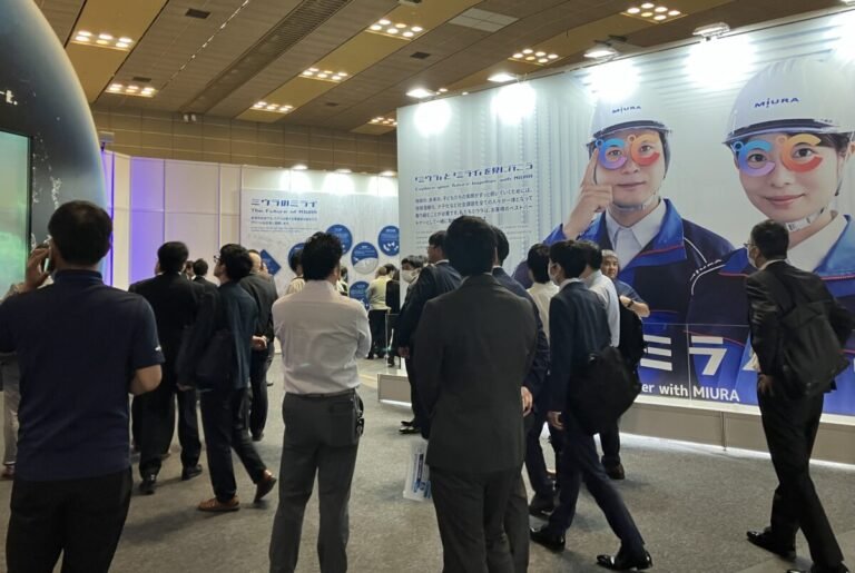 会場の中心には、松山本社にある「ミウラコネクトセンター」を再現。工場内の機器をオンラインでつなげて、「まるごとメンテナンス」のサービスを体感いただけるコーナーが出来上がっています。全面の4×2.5mの大型LEDモニタはミウラフェア初の採用です。