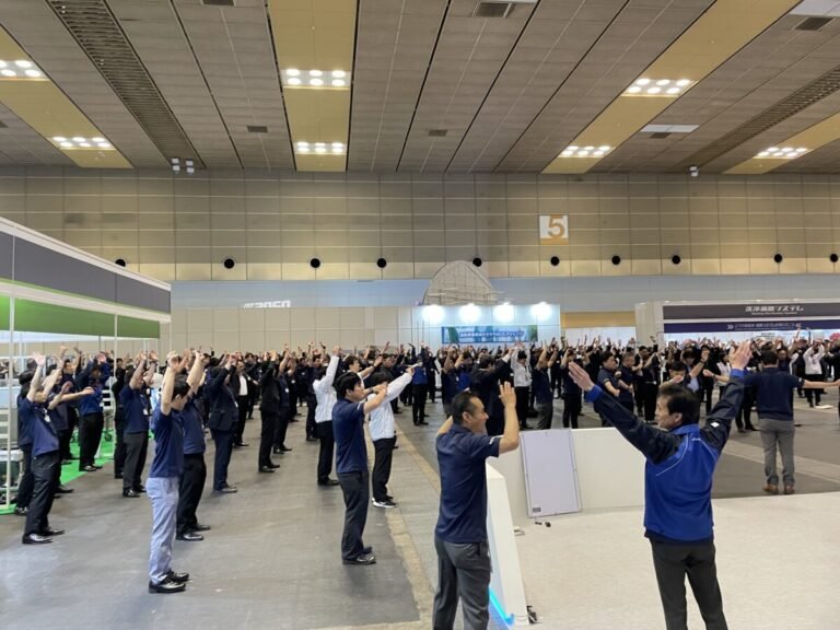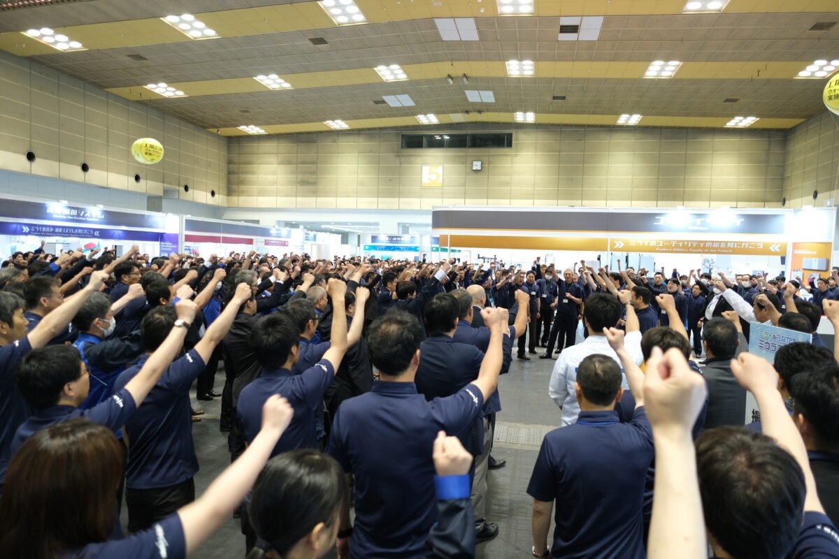 開催初日8:30に約300人で朝礼。ミウラの朝はラジオ体操から始まります!西日本事業ブロック執行役員の井戸さんからの激励後、気合を入れて、笑顔でお客様をお迎えします。