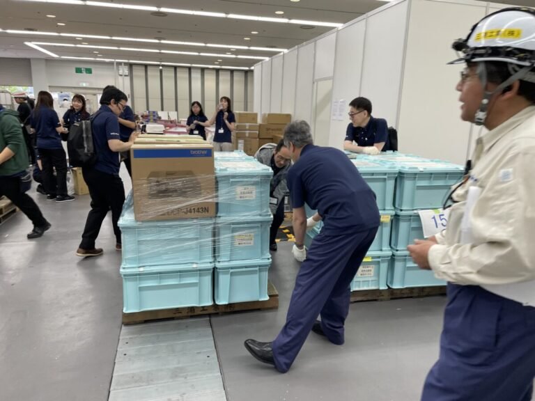 各機器は搬入時と同じように養生シートを掛けてトラックに積み込み、備品はパレットにまとめラップを巻きます。