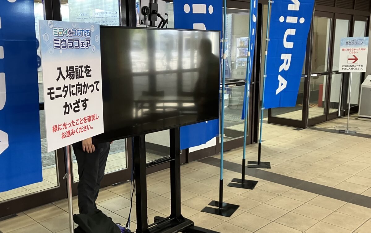 入場証はケースを無くした紐だけのエコ仕様です。入口カメラが入場証のQRコードを自動で読み取り、来場者の入場情報を確認しています。このシステムはミウラ初の取り組みです。