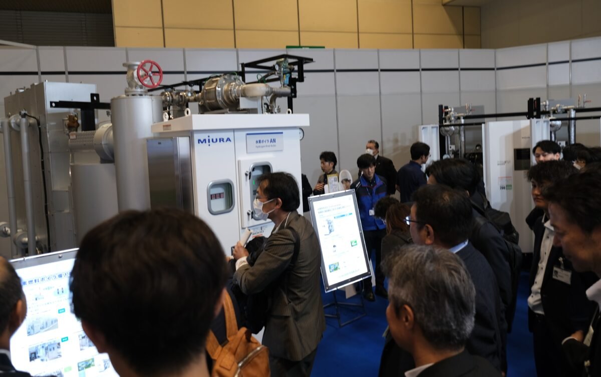 日本政府は、2030年までにCO₂排出量46%削減目標を掲げています。ミウラも、電気ボイラ、水素燃料ボイラの実機を展示。低炭素を実現できる製品を取り揃えていますので、お気軽にご相談お待ちしていますとのこと。