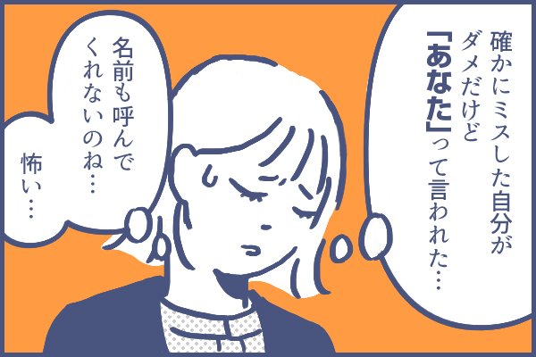 Episode1: 実は怖い⁉いきなり「あなた」呼び (どうしよう…うっかりしてて提出できてない資料が… XXさんに報告しなきゃ) 「あなたはなにをやっていたのですか?」 (確かにミスした自分がだめだけど「あなた」って言われた… 名前も読んでくれないのね… 怖い…)