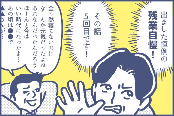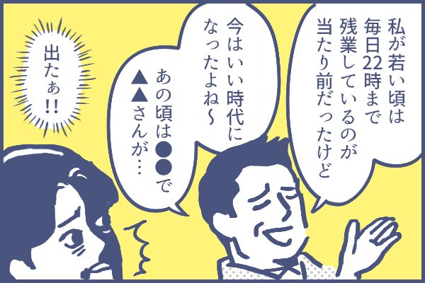 Episode2:過去の武勇伝でマウントをとる先輩 「今日は帰ります~お疲れさまでした~」 「お疲れさま~」 「私が若いころは毎日22時頃まで残業しているのが当たり前だったけど今はいい時代になったよね~あの頃はXXでXXさんが…」 (出たぁ!!) (出ました恒例の残業自慢! その話5回目です!) 「全然寝てないのに なんか元気だったよね。あれなんだったんだろう。本当に今はいい時代になったよ~。あの頃はXXでXXさんが…」